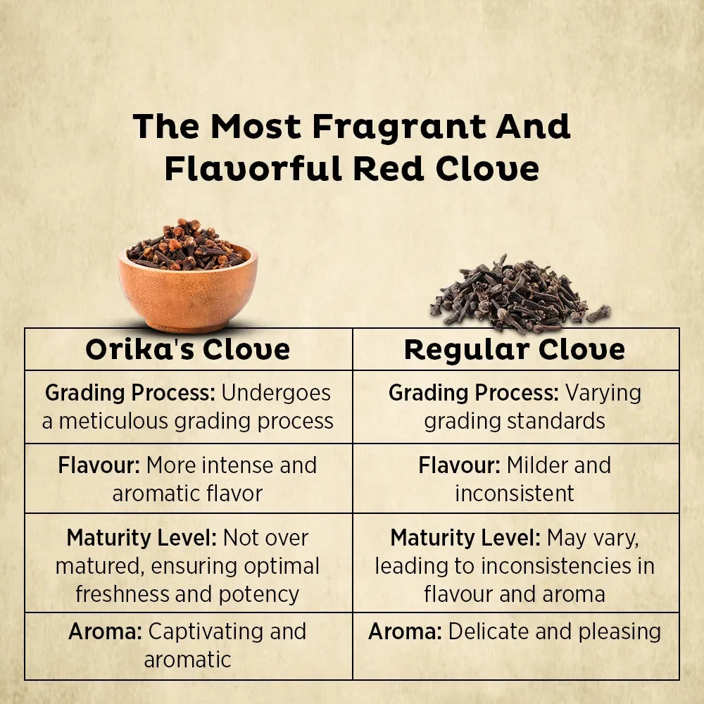 Orika's Lal Pari Clove (Laung) is the finest grade of cloves harvested from the Madagascar region of the southeastern coast of African Islands. With its fertile soil and perfect Ph levels, this grade of cloves contains high level of eugenol that adds to its flavor and delivers a perfect, sweet and savory flavor to your dishes.