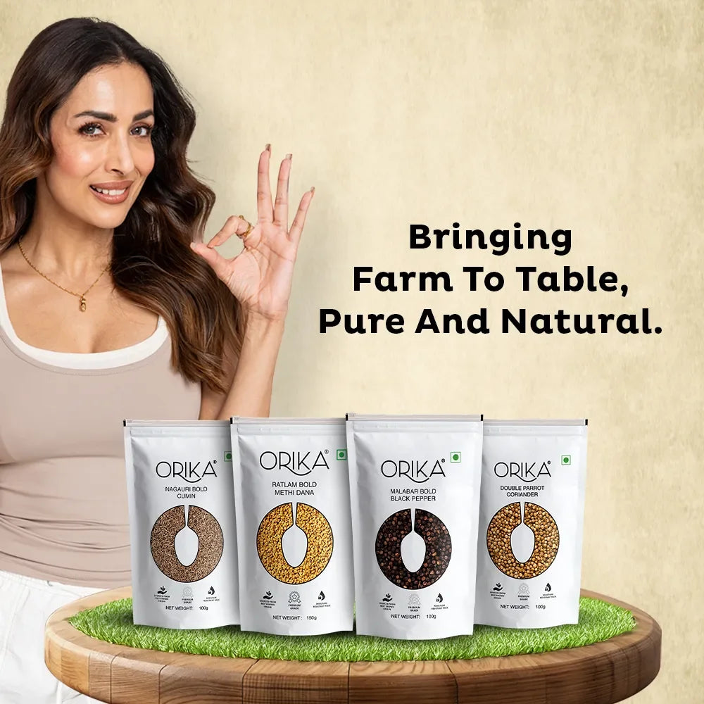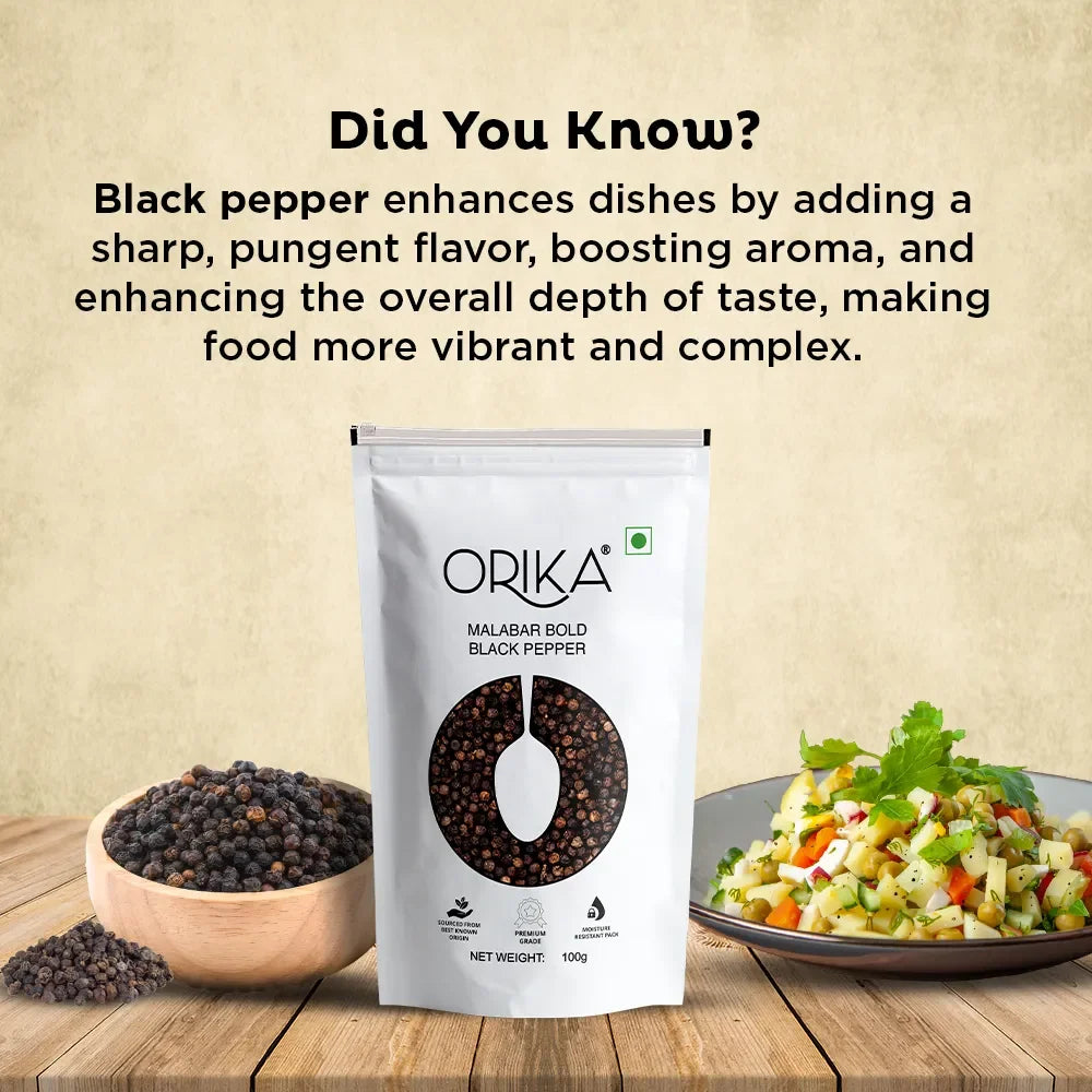 Orika's Malabar Bold Black Pepper comes from Kerala's Malabar region, known for the world's finest quality of black pepper with high piperine content and potent antioxidant properties. Grown in the black soils of Malabar, black peppercorns are left to ripen in the open a little longer to get the complex and fresh flavor.