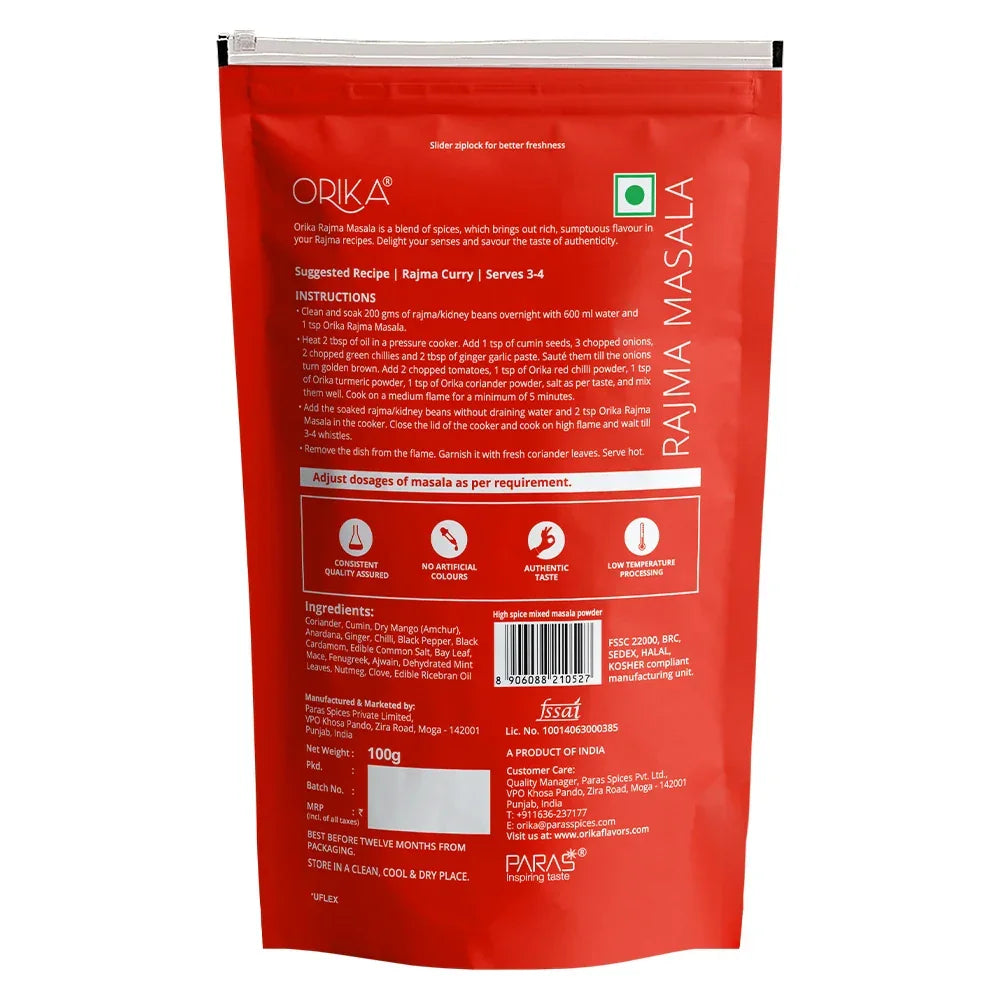 Savour the taste of authenticity with Orika’s Rajma Masala. An evergreen favourite at the Indian kitchens, Rajma features kidney beans in scrumptious, spicy gravy, best paired with rice. Orika’s Rajma Masala is a magical formula to infuse a bold & creamy flavour in this classic recipe. An assortment of most premium & pure varieties of spices, it makes all Rajma dishes taste exquisite.